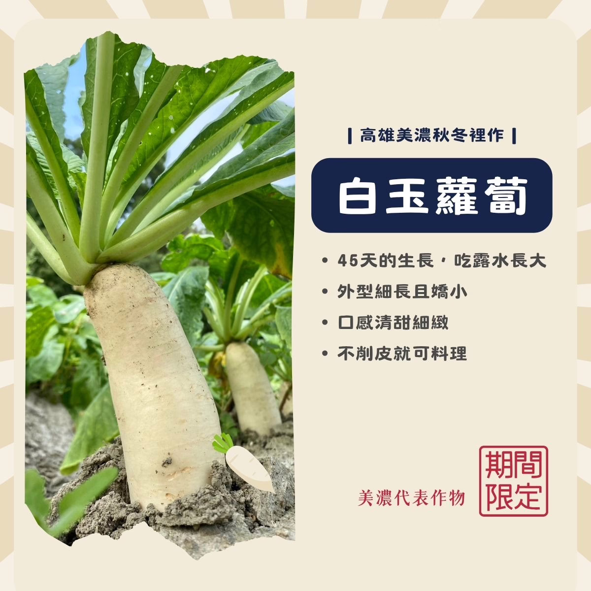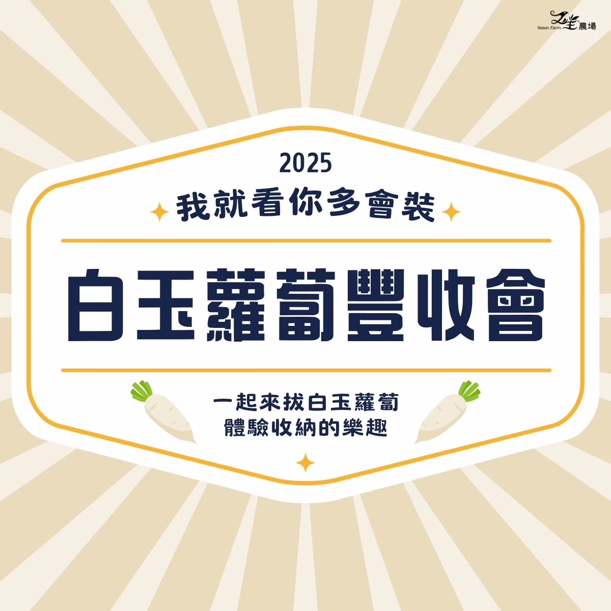 2025 白玉蘿蔔豐收會 活動資訊 活動場次: 114/12/13(六) 活動地點: 美濃區中山路二段(九井加油站後方河堤路)活動時間臨近時,將會寄發活動地點的定位連結 活動梯次: 上午|09:00 開園;下午|14:00 開園 活動費用 150元購買1個袋子 裝好裝滿裝多多,袋子不破就全部帶回家! 小編最高紀錄 1 個袋子承裝 7 斤蘿蔔!XD 注意事項 ➊ 切記!切記!袋子可以裝好裝滿裝多多,並且需用手提,袋子若塞破到無法承裝或需要抱著才能移動,那就…… 糟糕啦>< ➋ 如開園當天,主要報名者無法到達採收,主辦可接受指定代理人現場採收(需於開園前3日告知並提醒代理人攜帶身分證件,供現場確認),但不得更換田區及採收時間;若仍無法參與採收,則視同放棄。 ➌ 園區將劃分地塊,如經發現採拔他人地塊作物,需負損害賠償責任。 活動梯次(點選下方選單) 12/13(六)上午場12/13(六)下午場請選取一個選項12/13(六)上午場12/13(六)下午場清除 體驗|白玉蘿蔔豐收會 數量 加入購物車 活動梯次(點選下方選單) 12/13(六)上午場, 12/13(六)下午場